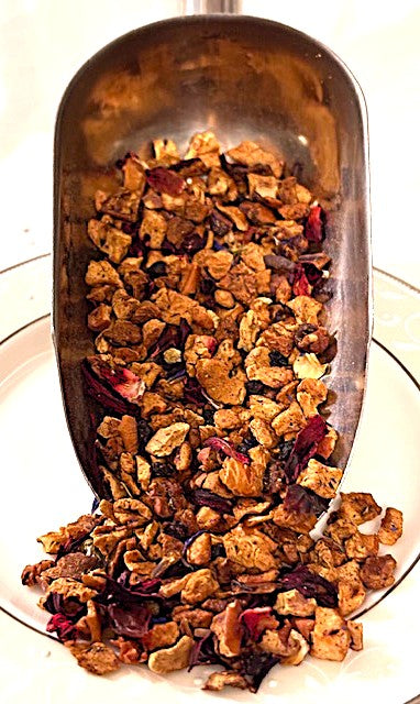 Ingredients: Apple Pieces, Hibiscus Blossoms, Elderberries, Freeze Dried Apples, Pomegranate arils, Rosehip, Blueberries, Cornflower, Mallow Flowers, Natural Flavor