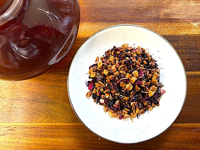 Taste Notes: Each sip is a celebration of summer-tart hibiscus and elderberries awaken the palate, followed by the soft sweetness of apples and blueberries. Pomegranate adds a vibrant pop, while rosehip offers a mellow citrusy note. The floral undertones from mallow and cornflower balance the blend with a soft, fragrant finish. Best served iced, garnished with fresh berries or a slice of citrus.